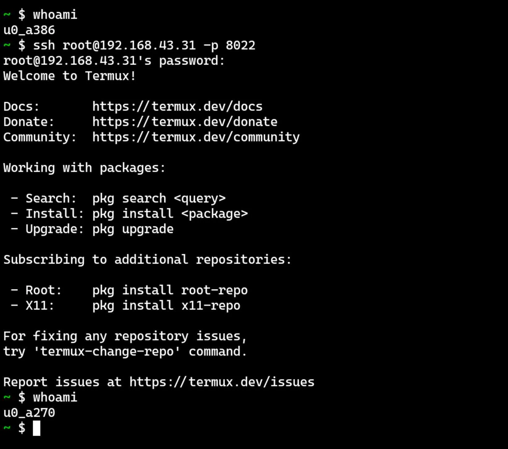 Sekarang kita pindah ke device yang satunya, kalau mau remote Termux dari PC juga bisa ya, asal satu jaringan lokal, kita cari dulu IP nya lalu konek via ssh