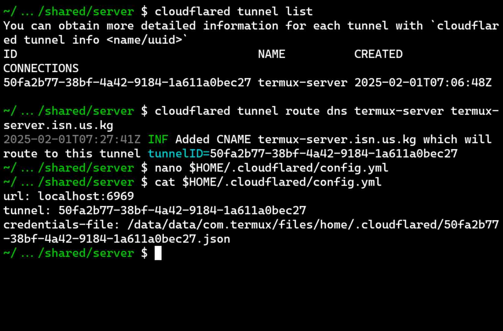 Sekarang kita akan routing tunnel ke hostname domain kita.cloudflared tunnel route dns termux-server sub.domainmu.tld